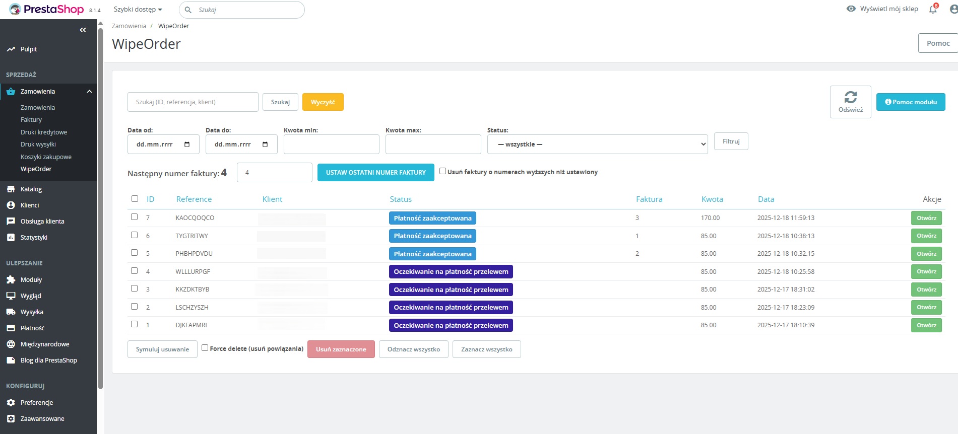 Wybierz zamówienia, które chcesz usunąć lub uporządkować, korzystając z listy i filtrów. Następnie uruchom tryb symulacji, aby sprawdzić, jakie zmiany zostaną wykonane. Po zatwierdzeniu operacji moduł wykona działania zgodnie z podglądem, zachowując spójność numeracji faktur i danych zamówień.